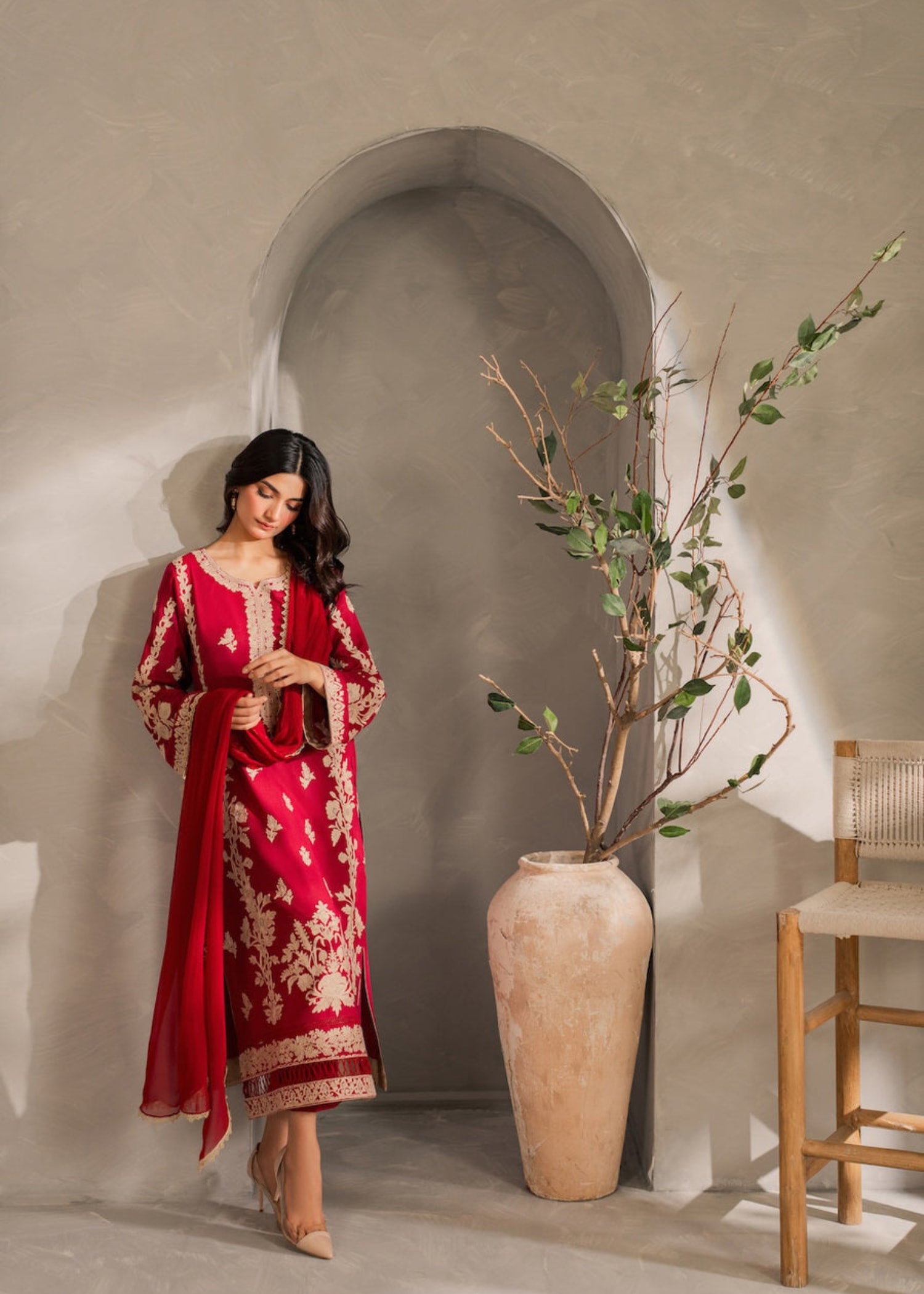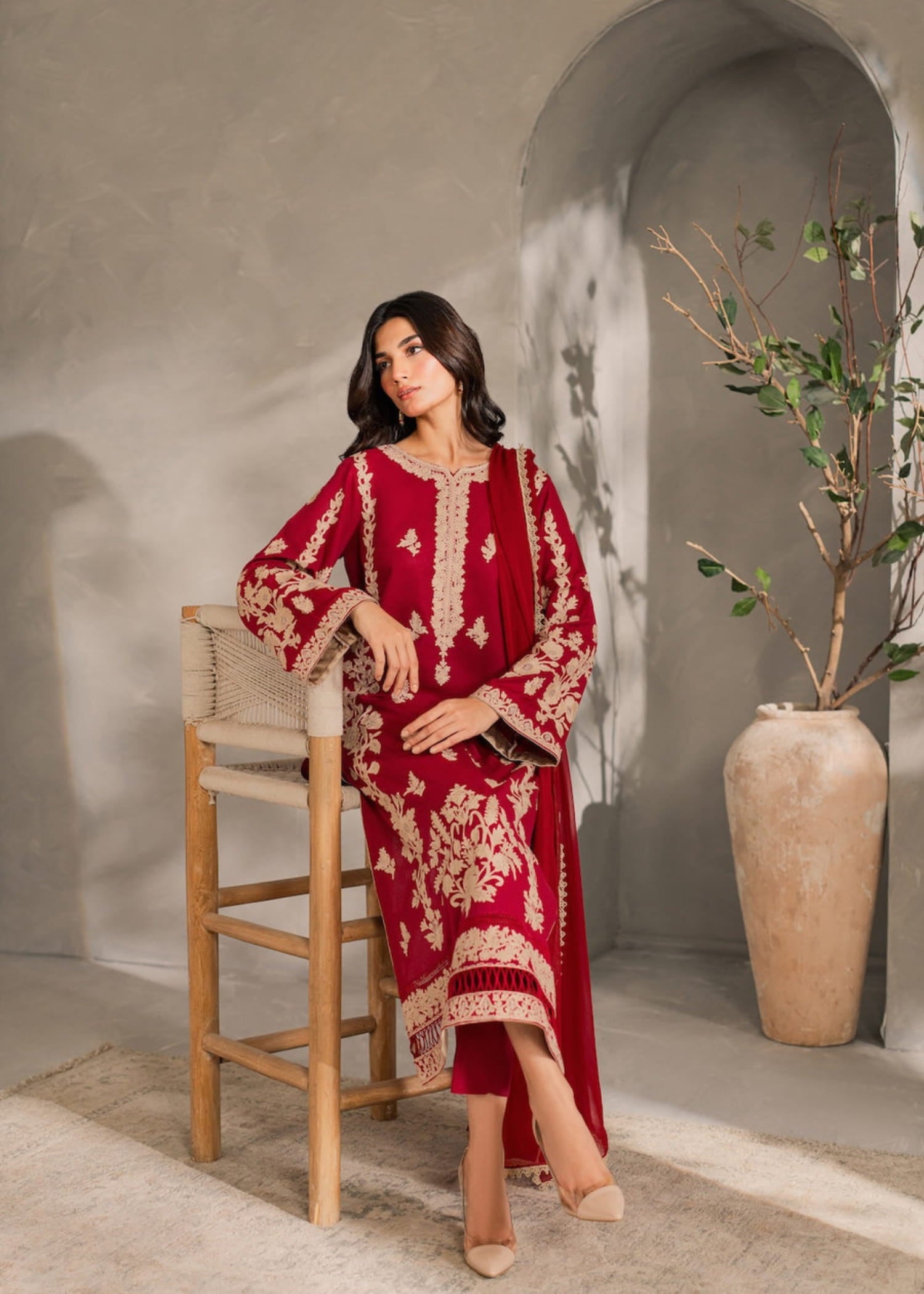 Crafted with premium fabric, this 2-piece embroidered outfit features a long, graceful shirt paired with standard-fit trousers. The rich mahroon hue adorned with delicate embroidery creates a look of pure sophistication — perfect for festive evenings and elegant gatherings.