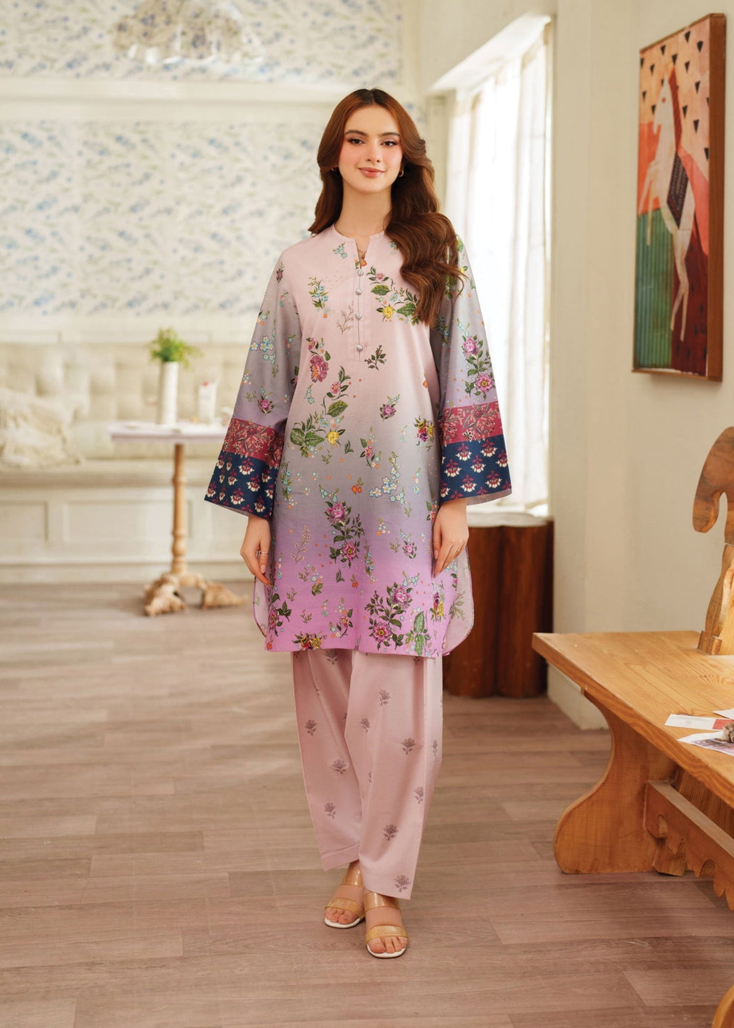 Stitched 2-piece outfit featuring a printed shirt and printed trouser. Crafted with premium grip fabric, this elegant attire is lightweight, breathable, and perfect for the season.