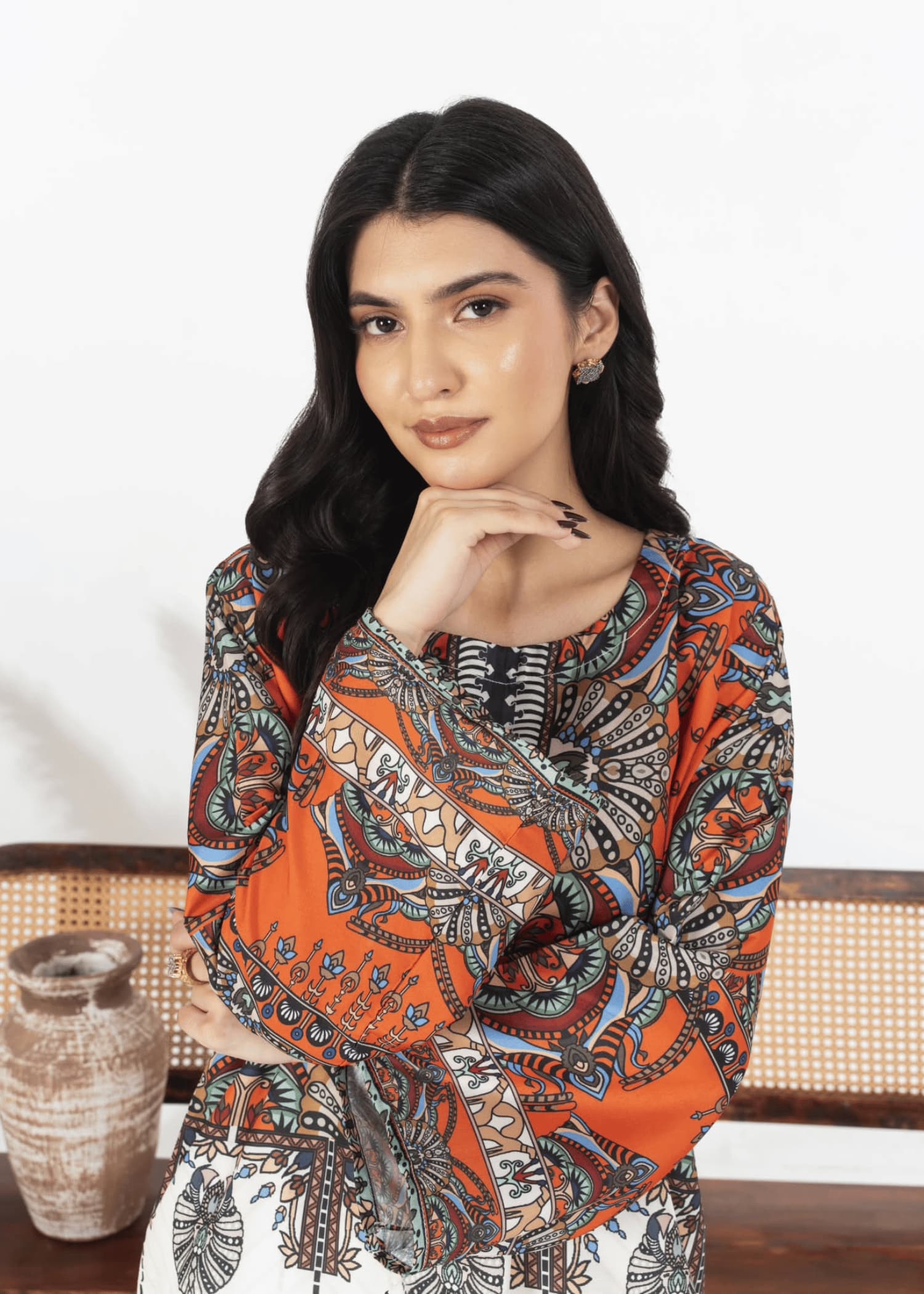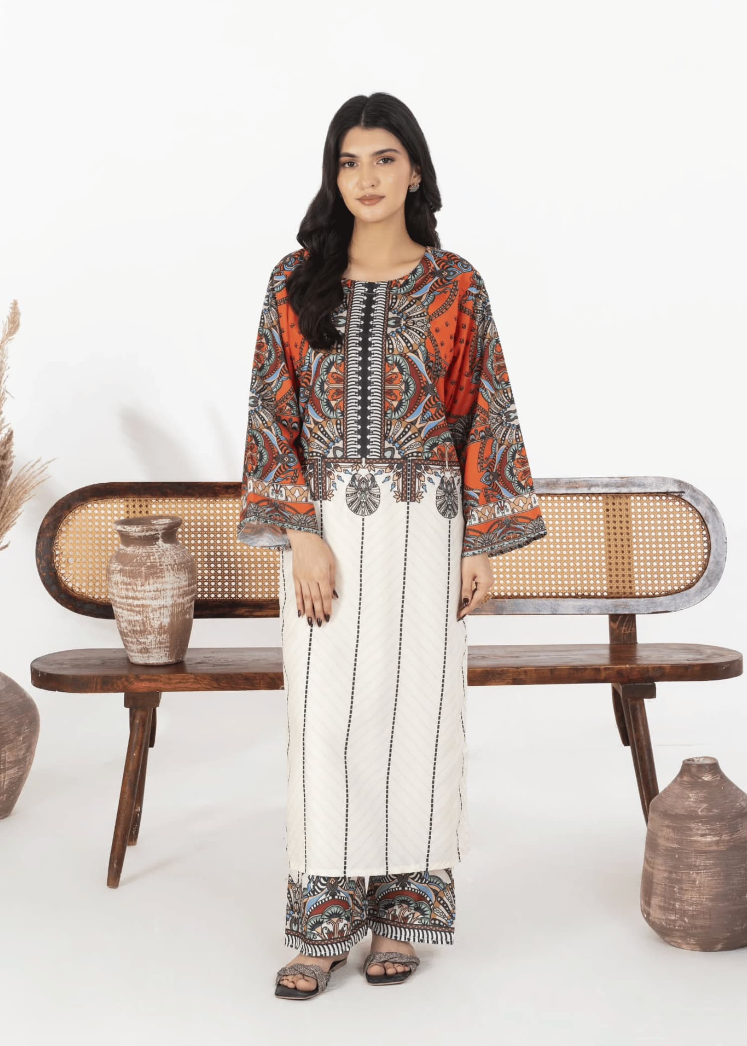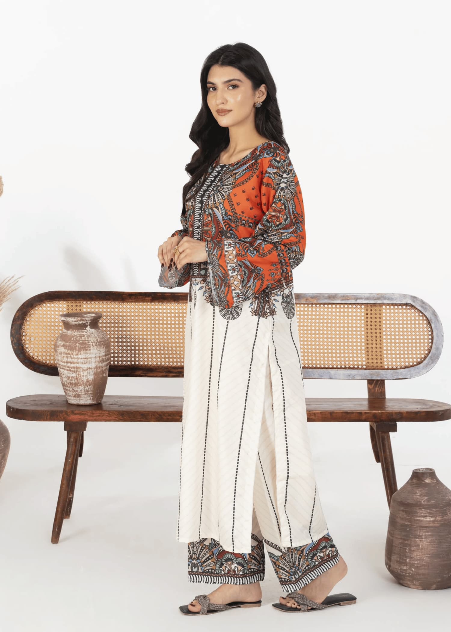 Keep it stylish yet comfortable with this two-piece ready-to-wear co-ord set in elegant cream. Featuring a sublimation printed straight-cut poly lawn shirt paired with trendy bell-bottom trousers, this outfit offers a chic everyday look. Crafted from lightweight poly lawn, it ensures breathable comfort, making it a perfect choice for summer wear, daily outings, or casual gatherings.