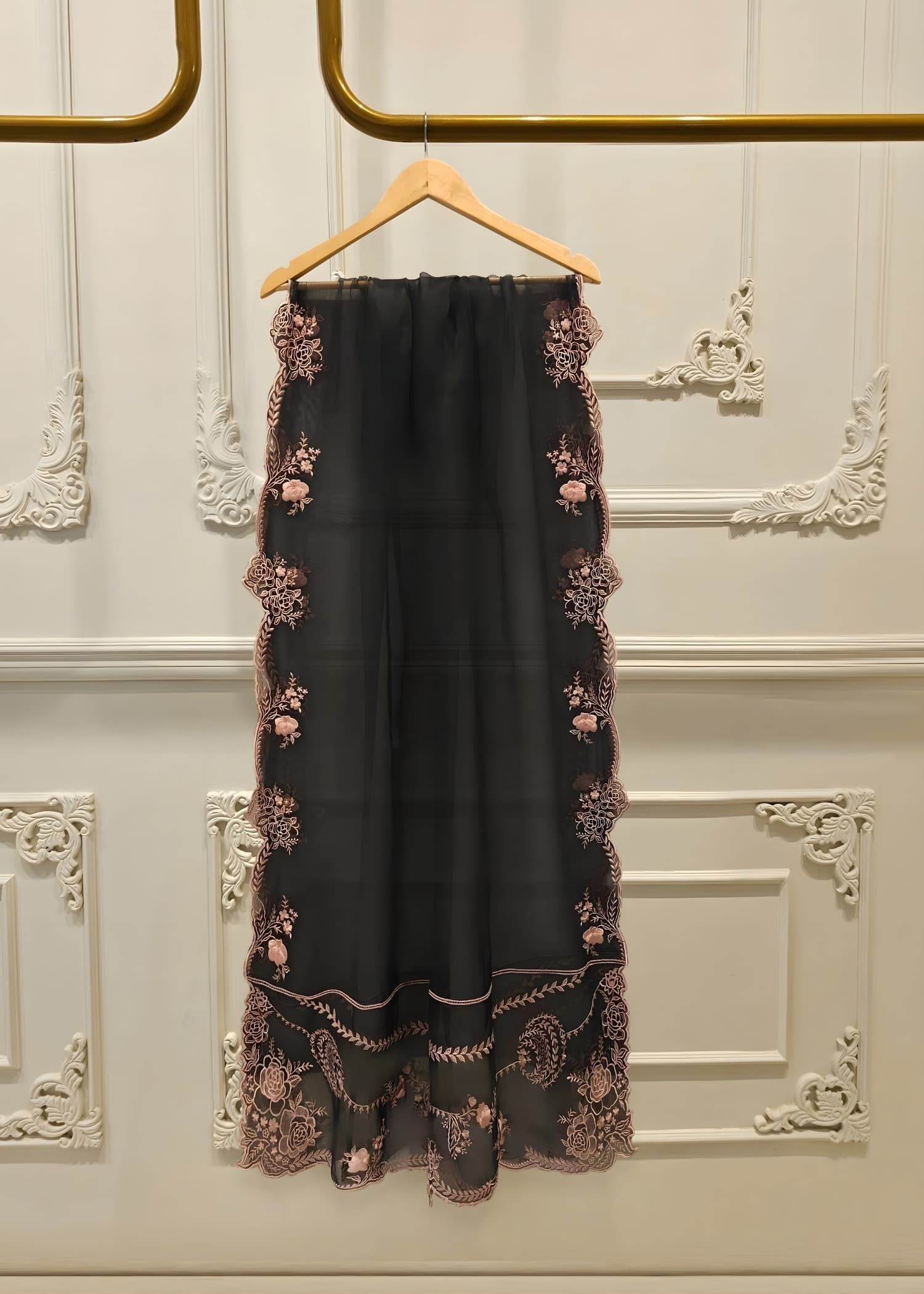 Redefine elegance this festive season with our Eid Lawn Luxury Collection in timeless Black. Crafted from premium cotton lawn, this exquisite 3-piece ensemble reflects refined sophistication with a modern edge. The shirt is adorned with intricate floral embroidery and delicate detailing, creating a statement look that exudes grace and luxury. Designed for women who appreciate standout style, the flowing silhouette paired with a comfortable plazzo ensures both elegance and ease. Perfect for Eid gatherings, festive evenings, and summer celebrations, this outfit blends tradition with contemporary charm effortlessly.