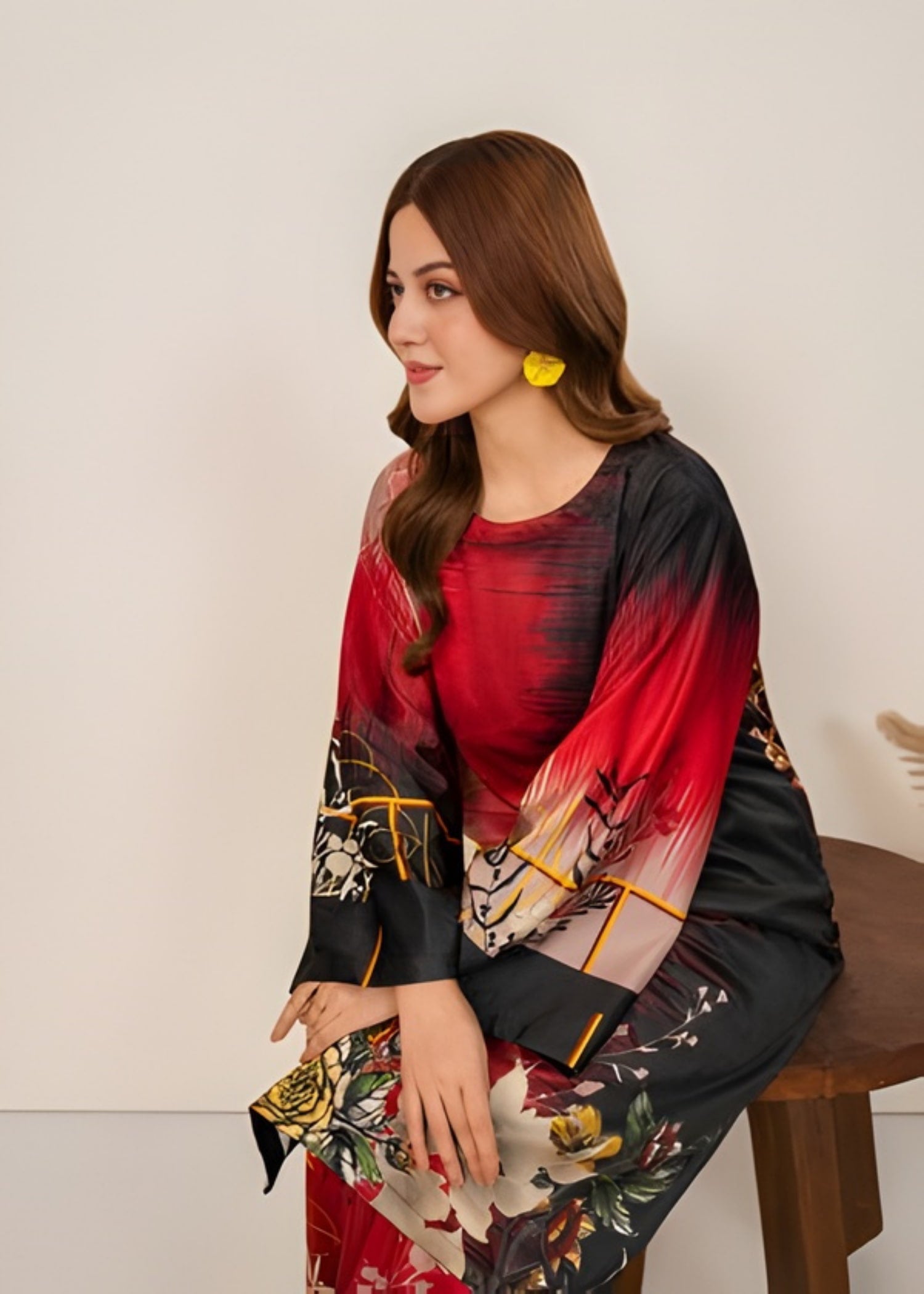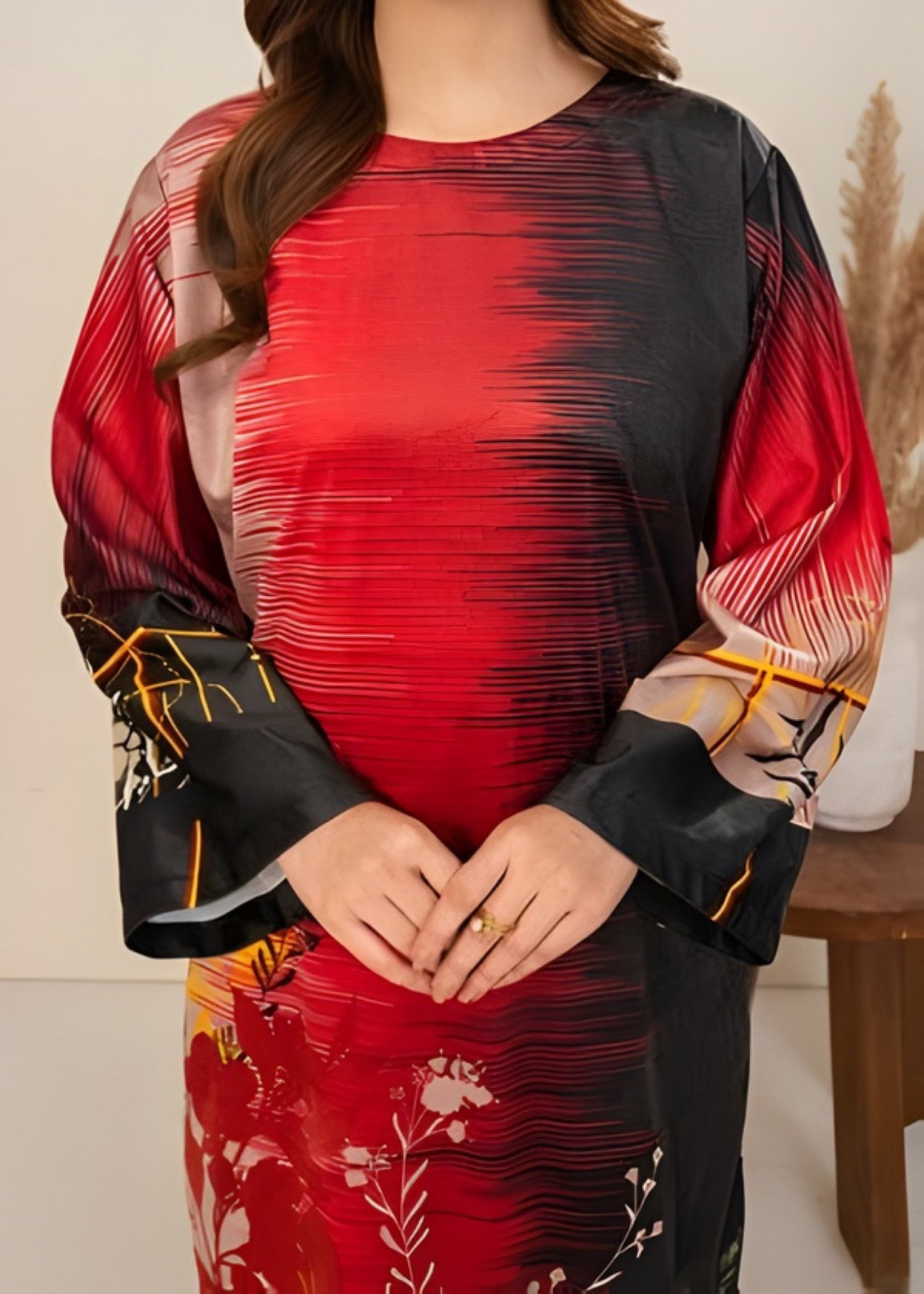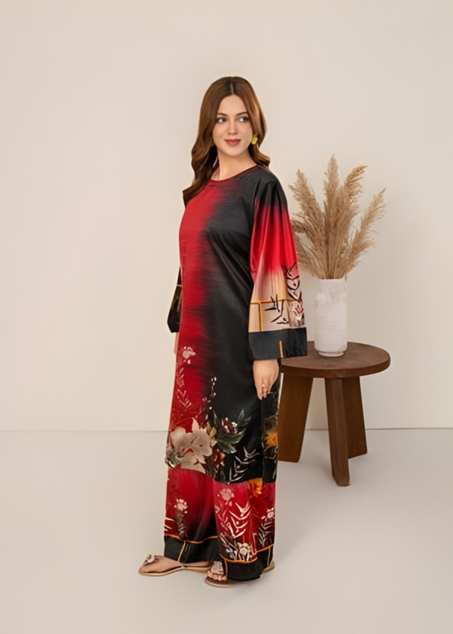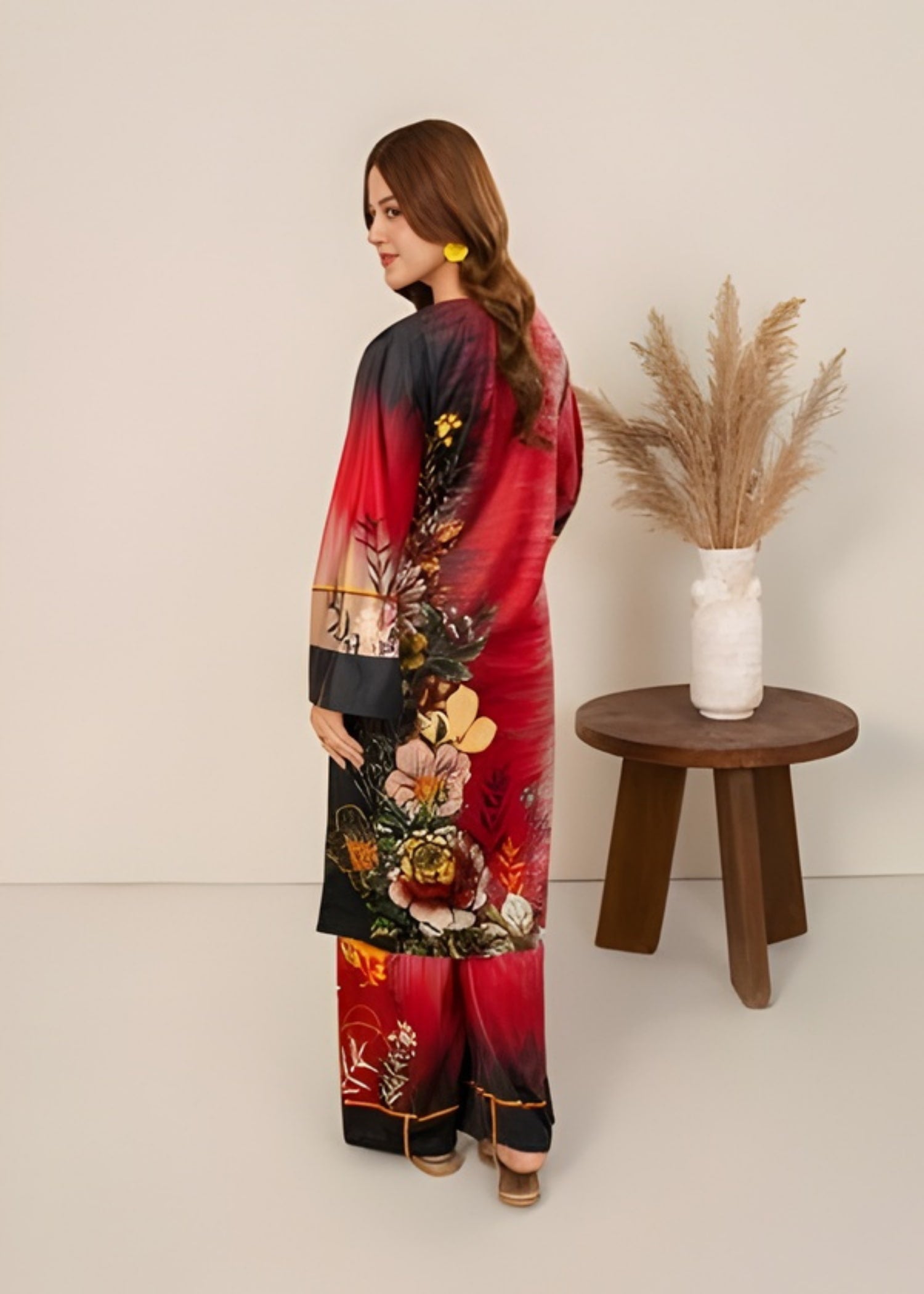 Upgrade your winter style with this Velvet Redish 2-Piece, crafted from premium soft velvet for a warm and elegant feel. The outfit features a sublimation printed design with redish multi tones, giving it a bold yet classy winter look. The straight-cut shirt combined with bell-bottom trousers creates a chic silhouette perfect for winter gatherings and casual outings.